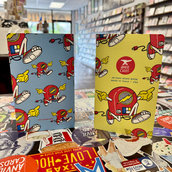 Set of two 48-page note books. 4.5 inches by 7.5 inches. Trimming and corner rounding by manual means. Designed, assembled and packed by real human hands.
